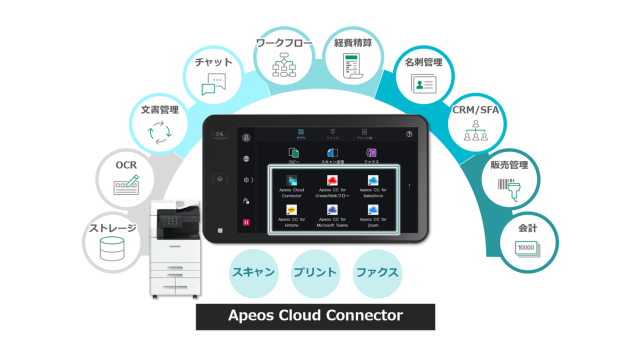 『Apeos Cloud Connector』は、複合機をクラウドサービスに接続するためのサービスです。複合機でスキャンした文書を指定したクラウドサービスに保存したり、クラウドサービスに保存した文書をプリントすることも可能です。