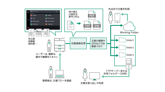 『業務別らくらくスキャン Pro』は、文書の種類を選択するだけで、あらかじめ設定されたルール通りにファイル名をつけ、所定の保存先に直接スキャン文書を格納できます。