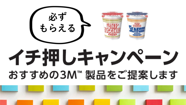 「3Mイチ押しキャンペーン」のご紹介です!! 期間中3Mの対象製品をご購入で、 日清カップヌードル&シーフードヌードルがもらえるお得なチャンスです! 定番のポストイット各種をはじめ、…