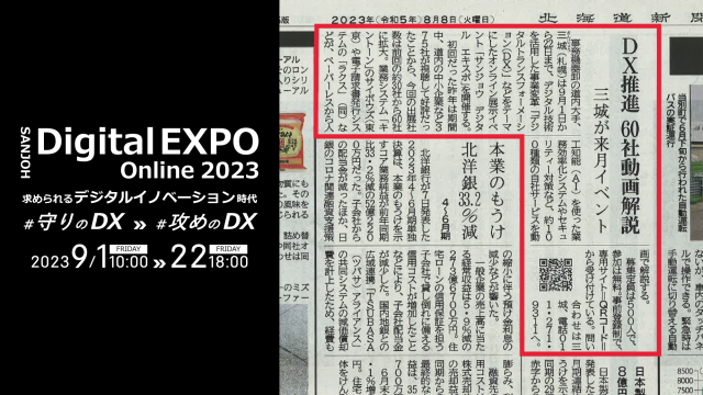 昨年に引き続き、株式会社北海道新聞社が発刊している「北海道新聞」(日刊 2023/8/8 火曜日)に、SANJOH Digital EXPO Online 2023を記事として取り上げていただきました…