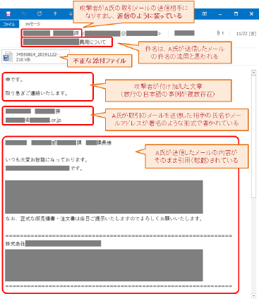 差出人は、実際の顧客や業者になりすましています。本文を確認し、添付ファイル開封には注意してください。