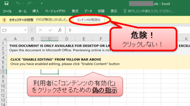 ※添付ファイルを開封してしまっても、「コンテンツの有効化」をクリックしなければ感染を防げることが多いです