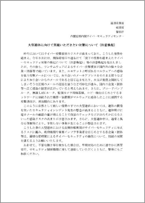 政府機関は国内の企業・団体に向けて、連休明けは溜まったメールの確認量が増え、チェックが甘くなることでPCウィルス感染のリスクが高まるとして「セキュリティ」を十分確保するよう注意喚起を行っています。