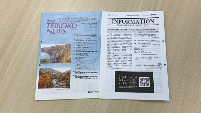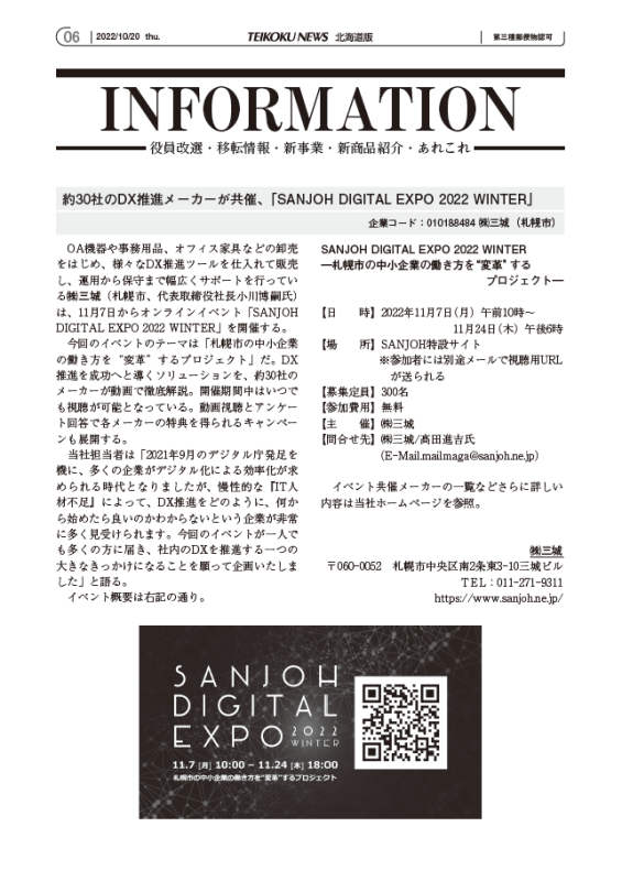 この度、株式会社帝国データバンクが発刊している「帝国ニュース 北海道版」(NO.5899 2022 10/20 thu.)に、SANJOH DIGITAL EXPO 2022 WINTERを記事として取り上げていただきました!