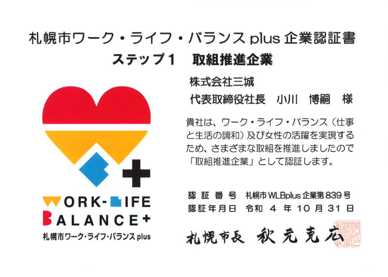 この度、札幌市ワーク・ライフ・バランス plus 取組推進企業として認証されました!