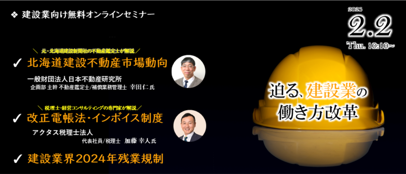 本セミナーでは、元・北海道建設新聞社の不動産鑑定士が「北海道建設業界の市場動向」を、税理士が「改正電帳法」「インボイス制度」における最新情報をわかりやすく解説いただきます。