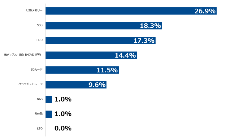 また電子帳簿のデータの保存先として採用しているものをアンケートで集計したところ、「USBメモリー」が26.9%で最多となり、次いで「SSD」18.3%、「HDD」が17.3%となりました。