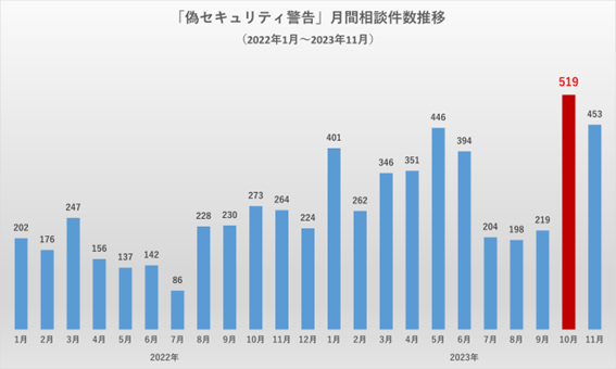 IPA「偽セキュリティ警告」の月間相談数推移(2022年1月~2023年11月)より
