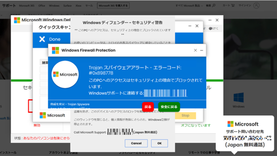 多くの企業やユーザーが利用している「Microsoft」製品ですが、実は巧妙な手口で騙そうとする成りすましの詐欺があることをご存知でしょうか?もし、突然PC画面に“ウイルスに感染した”といった内容が表示され、音声や警告音が鳴ってサポート窓口に連絡するよう求められたらどうしますか?実はこれ、お使いのPCに問題が発生したように見せかけ、ユーザーを騙そうとするサポート詐欺の手口なんです。