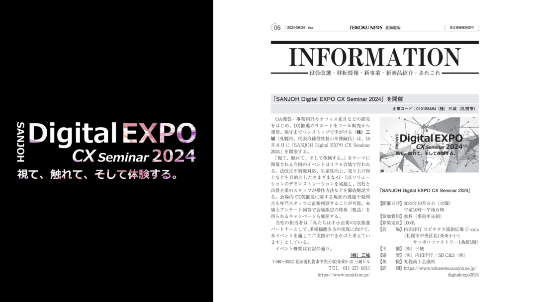 株式会社帝国データバンクが発刊している「帝国ニュース 北海道版(NO.6081 9/26 thu.)」に、SANJOH Digital EXPO CX Seminar 2024を記事として取り上げていただきました!