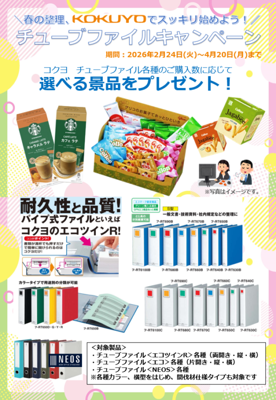 この春、オフィスや書庫の整理・書類管理を見直してみませんか。コクヨの人気チューブファイルを対象とした、期間限定キャンペーンを実施いたします。対象冊数のご注文で、うれしい景品をプレゼントいたします!(^^)/