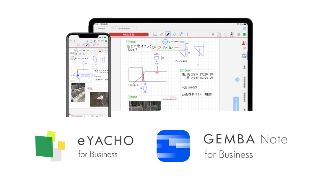 『eYacho・GEMBA Note』は、建設現場向けに特化されたデジタル野帳アプリです。紙の野帳をデジタル化し、手書きメモに加え、写真・動画・音声も記録でき、複数人でリアルタイムに情報共有・共同編集が可能です。