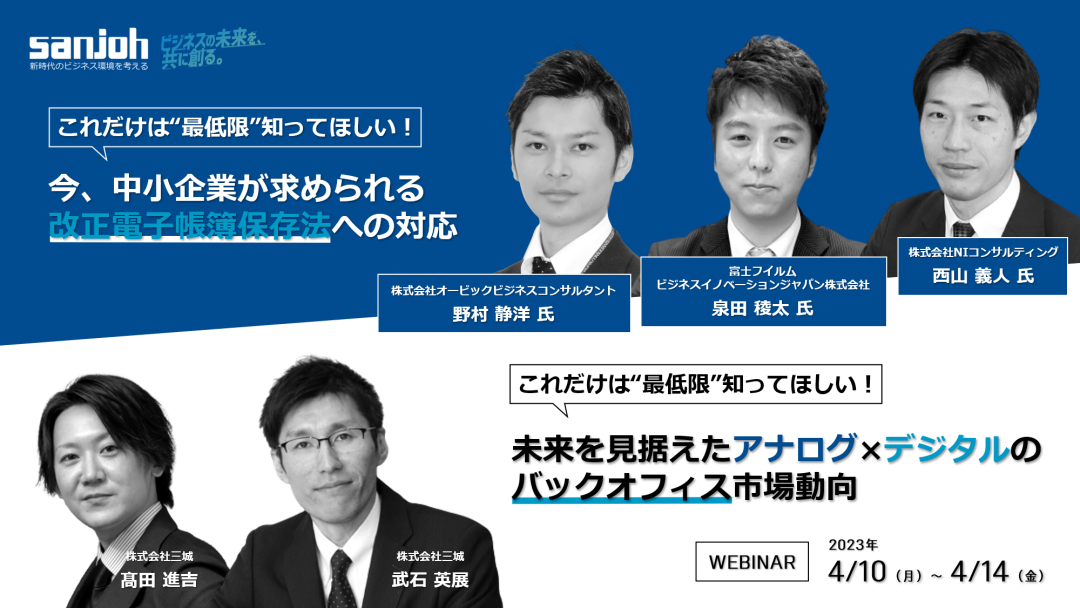 | 概要 | 今、中小企業が求められる改正電子帳簿保存法への対応 & 未来を見据えたアナログ×デジタルのバックオフィス市場動向 |