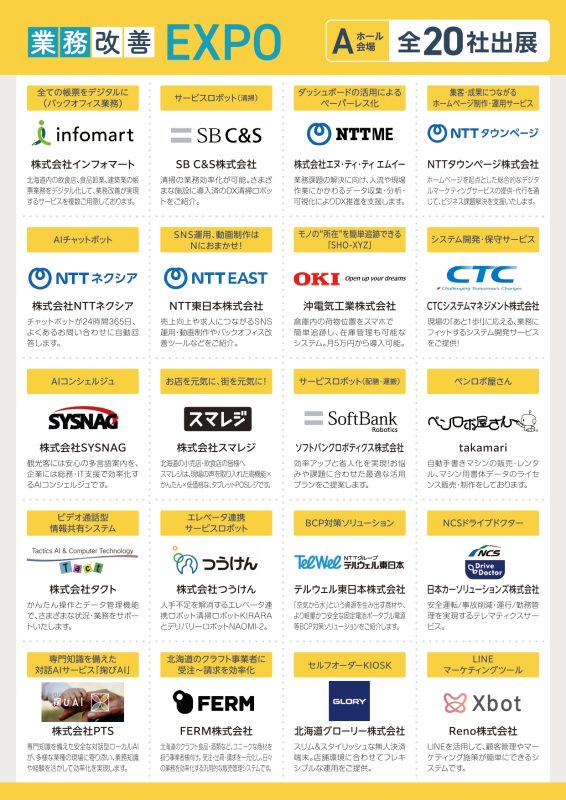 株式会社インフォマート/SB C&S株式会社/株式会社エヌ・ティ・ティ・エムイー/NTTタウンページ株式会社/株式会社NTTネクシア/NTT東日本株式会社/沖電気工業株式会社/CTCシステムマネジメント株式会社/株式会社SYSNAG/株式会社スマレジ/ソフトバンクロボティクス株式会社/takamari/株式会社タクト/株式会社つうけん/テルウェル東日本株式会社/日本カーソリューションズ株式会社/株式会社PTS/FERM株式会社/北海道グローリー株式会社/Reno株式会社