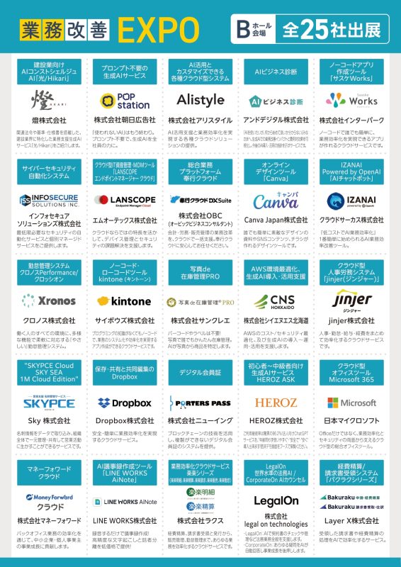 燈株式会社/株式会社朝日広告社/株式会社アリスタイル/アンドデジタル株式会社/株式会社インターパーク/インフォセキュアソリューションズ株式会社/エムオーテックス株式会社オービックビジネスコンサルタント/Canva Japan株式会社/クラウドサーカス株式会社/クロノス株式会社/サイボウズ株式会社/株式会社サンクレエ/株式会社シイエヌエス北海道/jinjer株式会社/Sky株式会社/Dropbox株式会社/株式会社ニューイング/HEROZ株式会社/日本マイクロソフト/株式会社マネーフォワード/LINE WROKS株式会社/株式会社ラクス/株式会社legal on technologies/Layer X株式会社